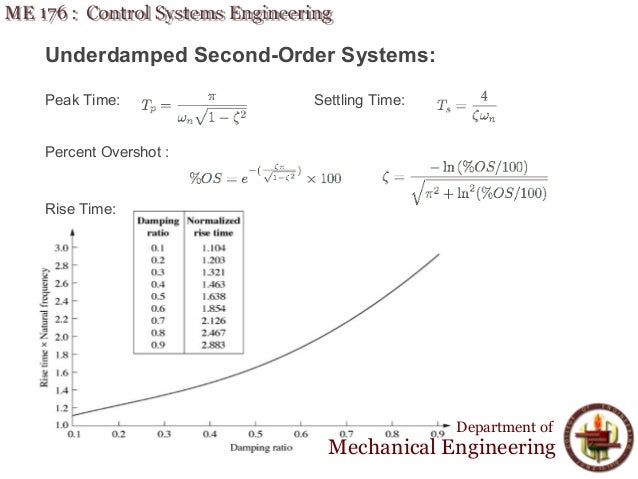 Typical unit step response of an underdamped (0 < ζ < 1) second-order system.damped oscillations, other important transient performance characteristics of a stable 2nd. For underdamped second order systems, the 0%to 100%rise time is normally used. The outputs after times equal to 3,4,and 5 time constants are 95.02%, 98.17%, and 99.33% of the final value, respectively.